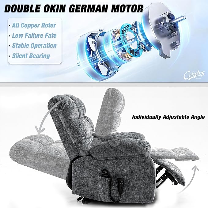 - 【Power Headrest & Lumbar】Power lift recliner built-in motor independently adjusts the headrest and lumbar part; without the influence of your body shape and sitting posture, you can enjoy the most comfortable angle and maximize the different body shapes of the user to get the most comfortable experience.