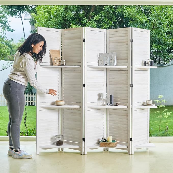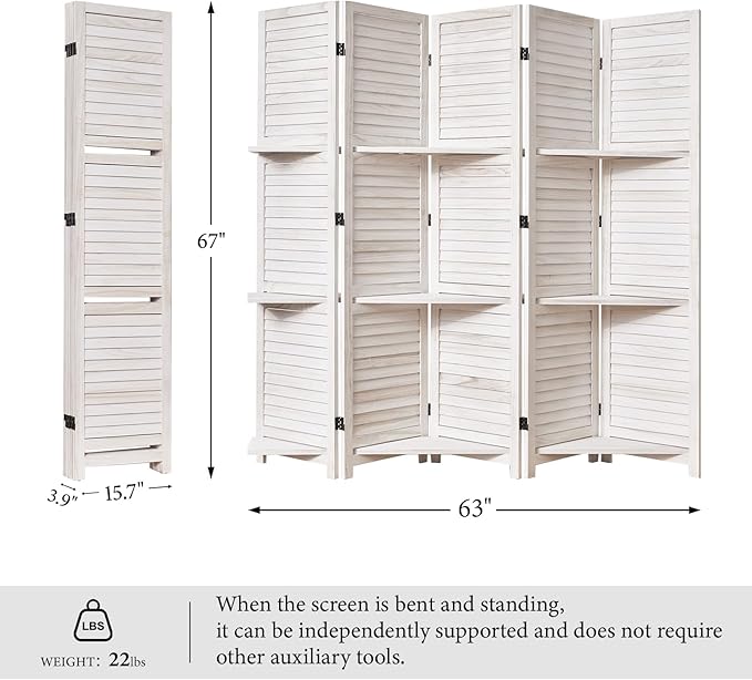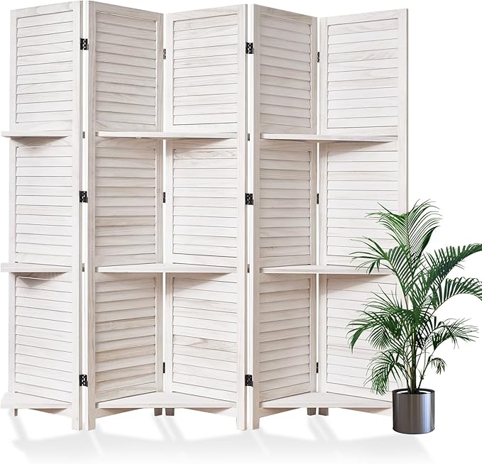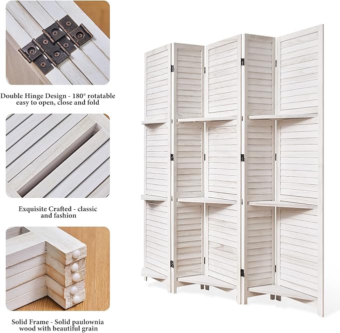 Partition Room Dividers, Folding Wood Privacy Screen with Three Display Shelves Suitable for Home Office, Study, Art Display - 5 Panel, 67 * 64inch (White-Washed)