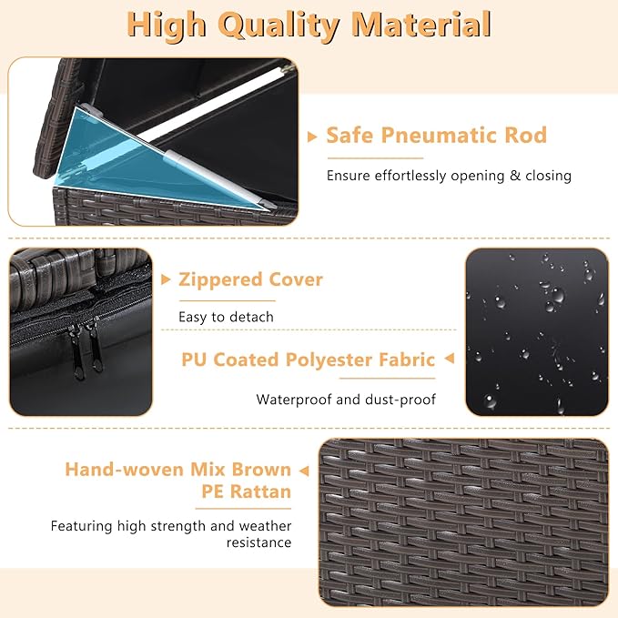 - 【Durable & Stable Structure】 The main body of the deck storage box is crafted with premium PE rattan, which features high strength and weather-resistance, ensuring enduring life. Additionally, the bottom reinforced metal bars and 2 extra middle feet offer it stronger support and increased stability.