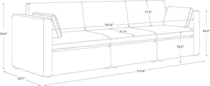 - 3-PIECE MODULAR SOFA WITH LARGER SEATS - CHITA modular couches feature clean and classic design with comfortable and wider seats to offer you a never ending relax after a long day. Each seat has a 34'' seat width - 30% larger than most counterparts. Individual seat dimension: 34''W x 21.5''D x 18.5''H. Only three seats are needed to achieve a 112'' overall width.