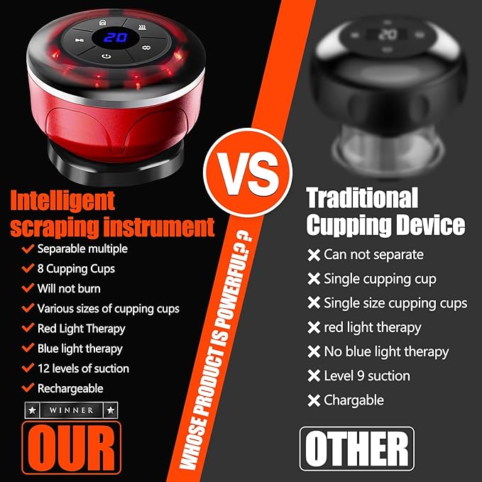 - 💖【4-in-1 smart electric cupping therapy set】Our smart dynamic cupping therapy set integrates respiratory cupping, scraping, massaging ,red light hot compress and other functions into one to provide a comprehensive physical therapy experience tailored to your massage needs, bring all-round relaxation to your tense muscle and entire body.