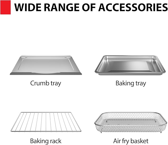 - ALL-ACCESSORIES-INCLUDED: Everything you need is included. Our oven comes with a removable crumb tray, baking tray, baking rack, and air fry basket for hassle-free cooking.
