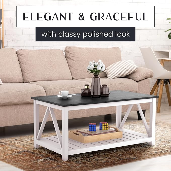 40" Farmhouse Coffee Table | Vintage Rustic Wooden Coffee Table with Lower Shelf for Living Room, Dorm, Office, Bedroom Center Table - Black