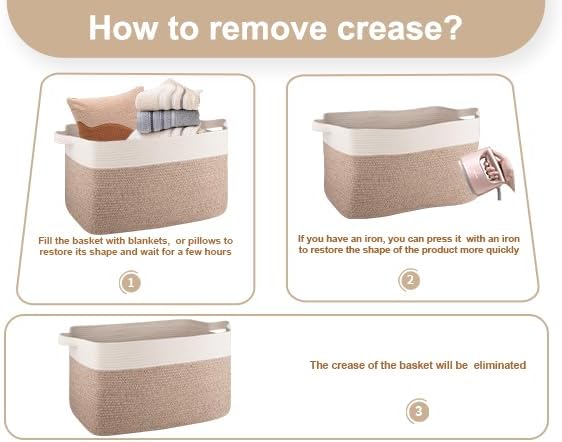 - Washable Woven Storage Basket: This rope baskets for storage can be washed by hand or machine with gentle detergent. If machine washed, please put them into a laundry bag. NOTE: These large basket for blankets are folded when shipping, but it will turn back to its elegant shape quickly if you fill it with some towels or clothing, and iron is great idea to remove the creases