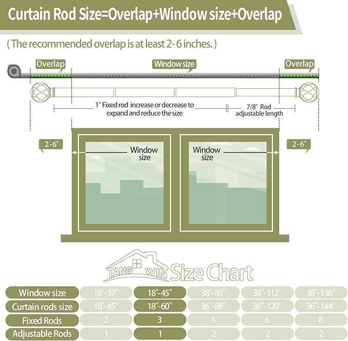 - Curtain Rods for Windows 18 to 60 Inch(1.5-5Ft):TANGWIN drapery rods include 3 x 16" x 1"fixed rods, 1 x 16" x 7/8"adjustable rods, 2 x finial, 2 x bracket, 2 x connector, 4 x anchor, 4 x screw.Brass gold curtain rods for windows can extend from 18 to 60 inches, choose the right size curtain rods according to the length of your window.
