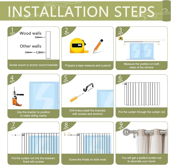 - Easy to Install Curtain Rods:TANGWIN provide detailed illustrated size instructions and modern decorative window curtains rod shipping package has detailed installation instructions inside, follow the steps,silver curtain rods can easily complete the installation.