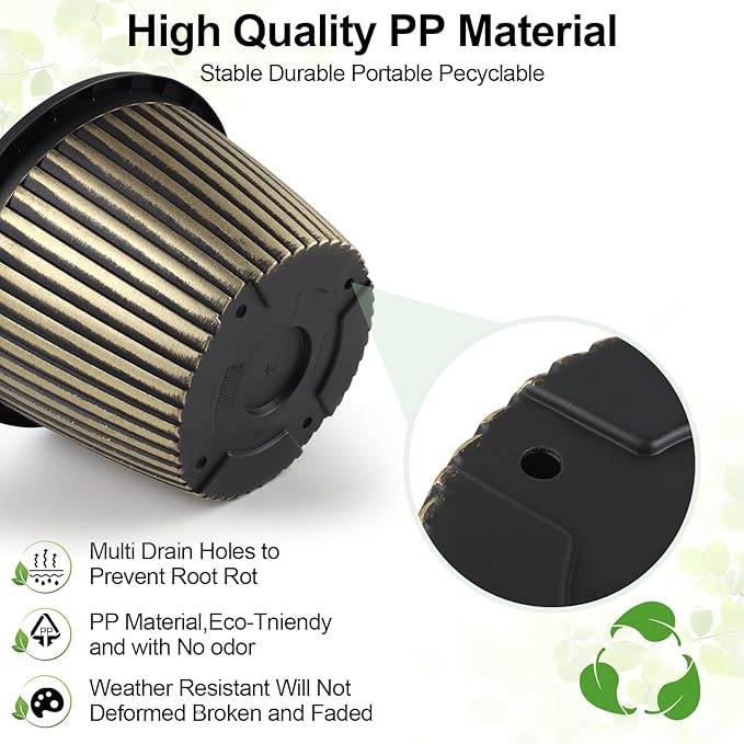 - 【MODERN STYLE PLANTERS】 Indoor planters with saucers provide a unique,nice style in ribbed design which gives an understated elegance that will enhance the beauty of your plant. These 12 inch plant pots are available in red-brown &blue-green & gold finished with a black antique stain. Plastic flower pots would be a beautiful addition to anyone’s deck or sunroom or house!