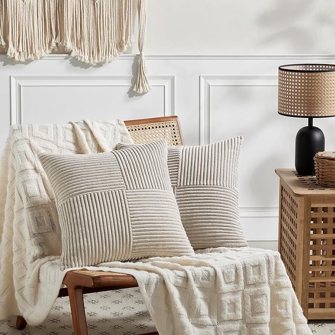 Fancy Homi 2 Packs Neutral Taupe Decorative Throw Pillow Covers 22x22 Inch for Living Room Couch Bed Sofa, Rustic Farmhouse Boho Home Decor, Soft Corss Corduroy Patchwork Accent Cushion Case 55x55 cm