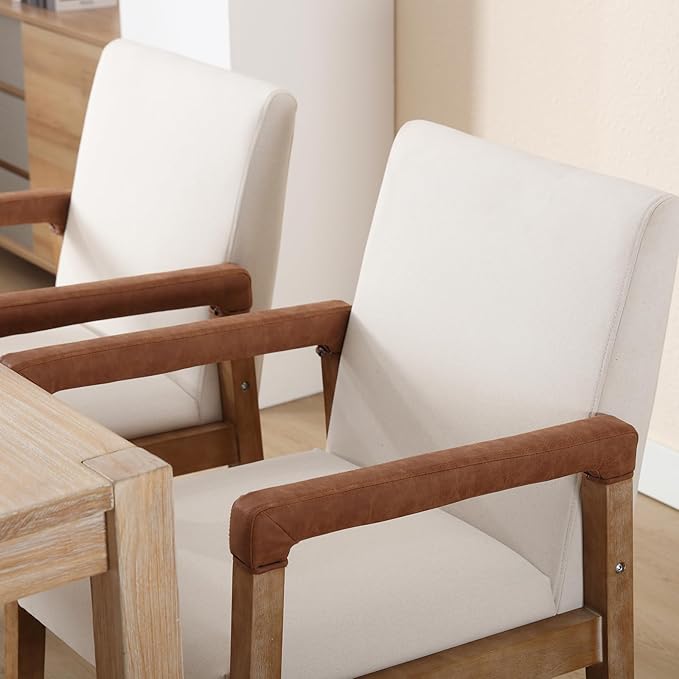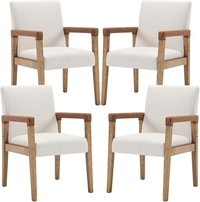 Mid Century Modern Dining Chairs Set of 4 Fabric Upholstered Living Room Side Chair, Kitchen Arm Chair with Solid Wood Legs for Home Restaurant, Linen White