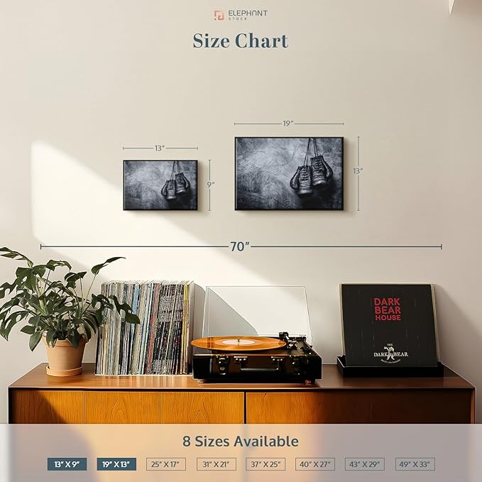 ElephantStock Boxing Gloves Wall Art - Horizontal Framed Canvas - 1-Piece Living Room Wall Decor - Photography Sports Canvas Print - Black and Gray Decor for Wall - 13" X 9"