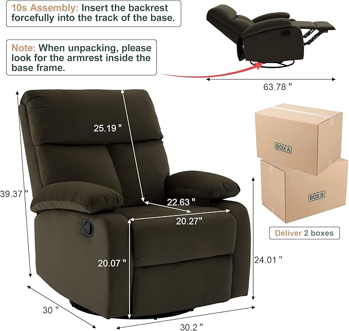 - Easy To Assemble: The rocker recliner swivel chairs for adults assembles in just 5 min. According to the instructions provided for the small rocker recliner, install the rocking recliner chairs for adults backrest onto the seat. The small swivel rocker recliner's user-friendly packaging, one person can also quickly operate, only 2 steps to complete the installation of the small rocker recliner, allowing you to immediately enjoy the leisure time brought by the hzlagm swivel rocker recliner chair