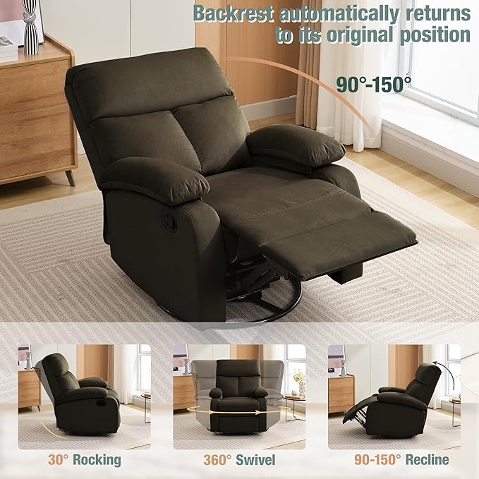 - Premium Materials Rocking Recliner: Our swivel rocker recliner is expertly designed with a high-density and high-resilience sponge cushion, guaranteeing both durability and extended comfort, even after long periods of sitting. The recliner rocking chair overstuffed armrests offer superior comfort and support. hzlagm swivel rocker recliner chair have carefully selected premium memory sponge that is both flexible and thick, guaranteeing that you receive the reclining chair you truly deserve