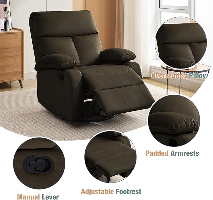 Swivel Rocker Recliner for Adults, Small Recliner Chair for Small Spaces, Rocking Recliner Chair for Nursery. Living Room, RV, Bedroom, Dark Brown