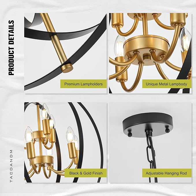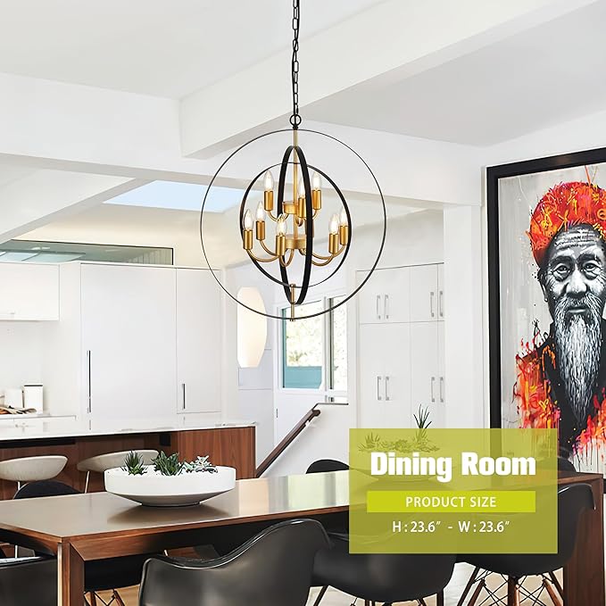 - 【Unique Design】Metal globe chandelier with adjustable round shade, by rotating the circle, you will get round chandeliers of different shapes. The vintage and black gold design will add a fashionable look, while complementing your rooms decor. suitable for living room, dining room, hallway, bedroom, kitchen island, etc.