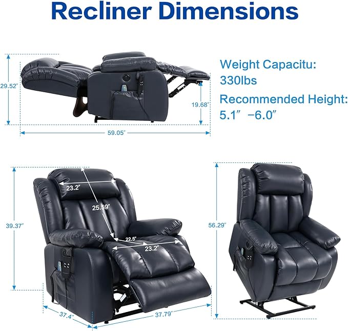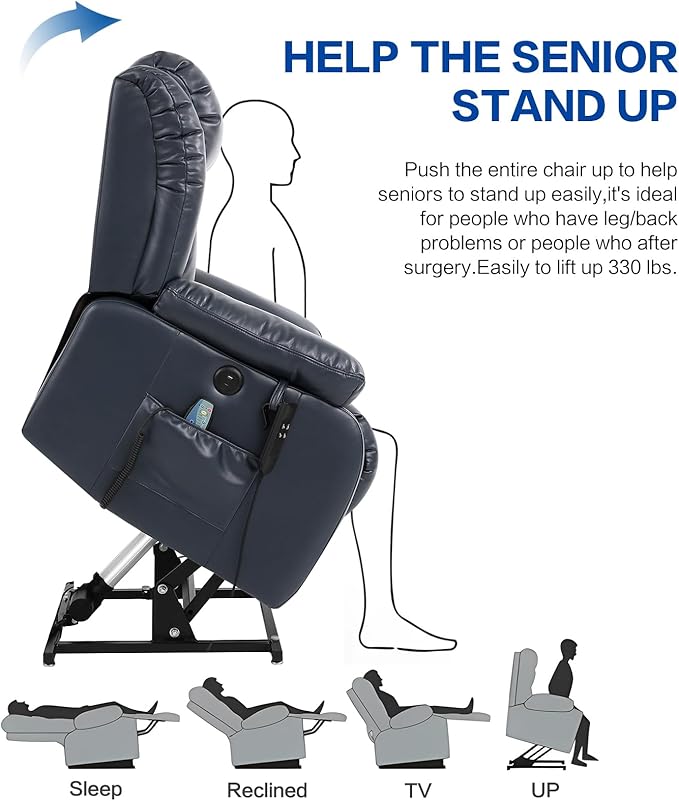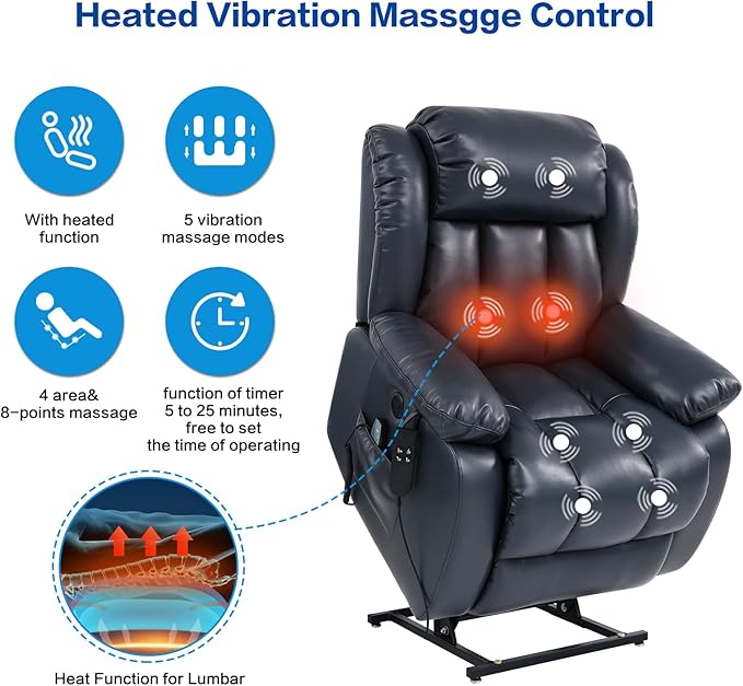 - 【Heating and Massage】The lift chair has eight massage points; three massage modes, the waist has a heating system that can provide waist care and heating for the elderly or other people in need; at the same time, the temperature-controlled heating system, 113℉~140℉, when it reaches 140℉, it will automatically cut off the power and continue to cool down to 113℉ before heating.