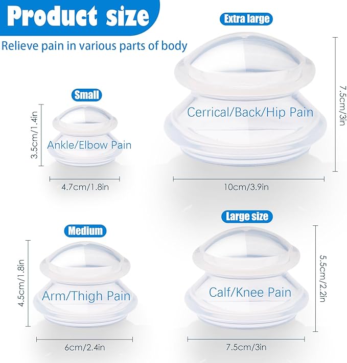 - Include:4 Massage Silicone Cups: Extra Large Cups (3.9”x 3”), Large Cups (3”x2.2”), Medium Cups (2.4”x1.8”), Small Cups (1.8”x1.4”), A delicate flannel bag, Easy to store those cups.