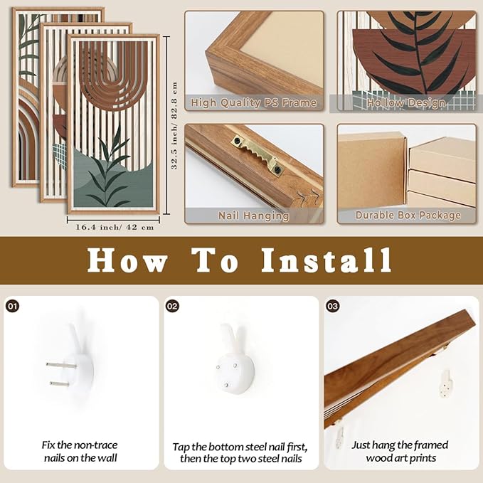 - 【Size Display】The large framed mid century modern wall art is about 16 × 32 inches. On the back of the high quality large boho wall decor, sawtooth hooks have been installed in advance, and the packaging box is equipped with straight seamless nails and anti-collision particles. So you can easily hang or disassemble the mid century modern wood wall art, very easy to operate.