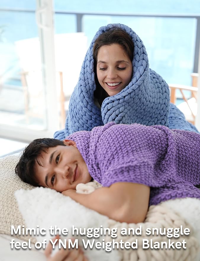 - [Style Meets Function] In order to mimic the hugging and snuggle feel of YNM Weighted Blanket, medium weight chunky yarn is chosen to hand knit this thick blanket(50x60 weighs 4.4lb, 60x80 weighs 7.3lb, 80x87 weighs 10.5lb). This thick chunky yarn not only provide soothing and relaxation feel, but also add texture to your blanket. Wrap around you on the sofa, layer the chunky knit blanket under your duvet or quilt to add warmth, or drape across your bed as a textural throw.