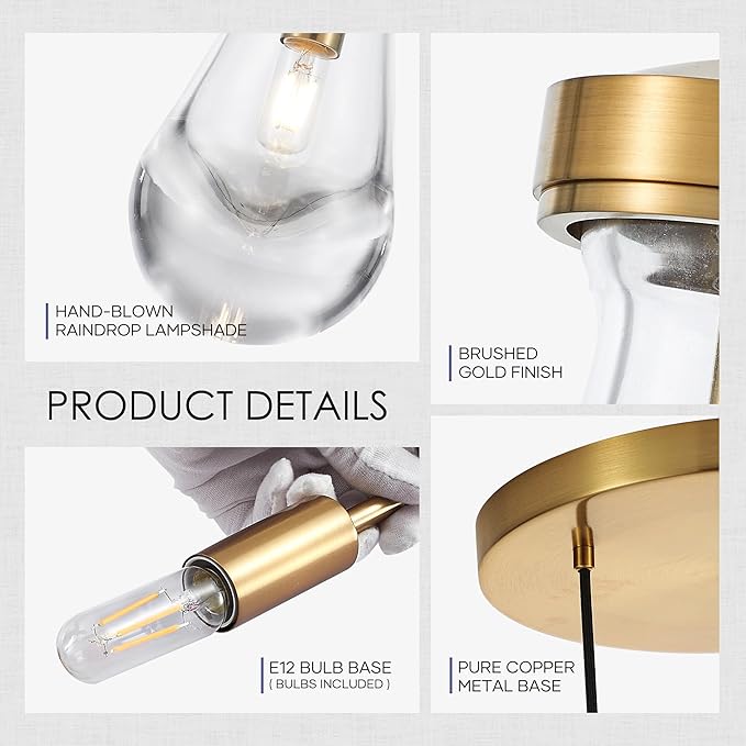 - 【Raindrop Design】This raindrop pendant light features a unique and captivating design that combines modernity with the beauty of nature. The handmade, mouth-blown glass shade resembles raindrops, creating a stunning light effect that enhances any space. Whether you prefer a modern or vintage farmhouse style, these pendant lights effortlessly blend in while illuminating your room with a bright and decorative ambiance.