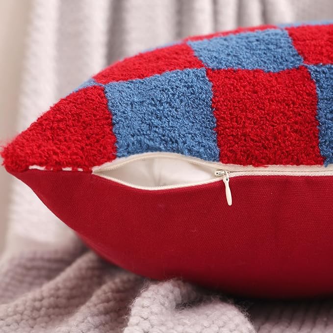 Alysheer Checkered Embroidered Decorative Throw Pillow Covers 18"x 18" Set of 2, Classic Chic Red Blue Plaid Tufted Patterned Cotton Canvas Cushion Case for Sofa Couch Bed Living Room