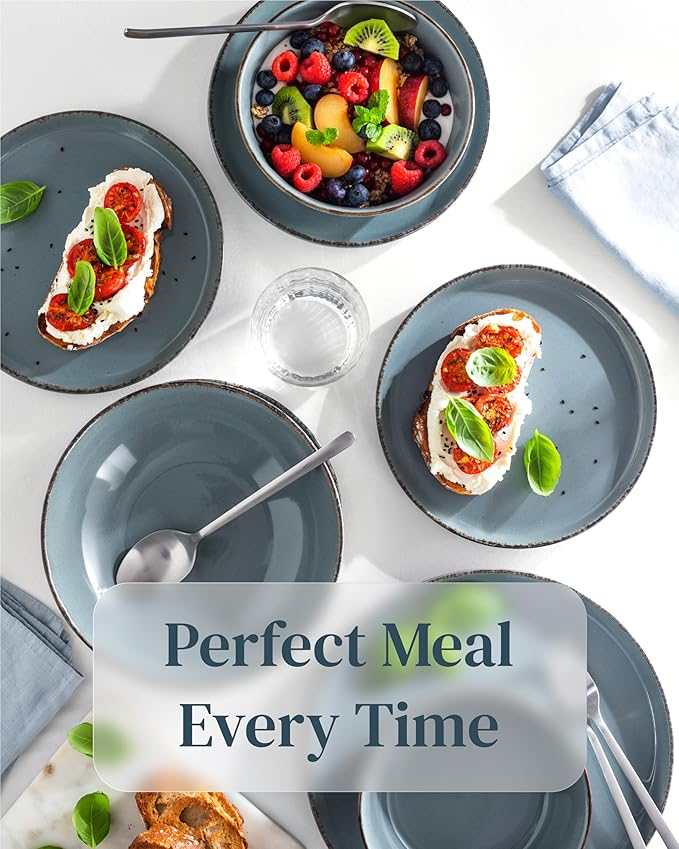- ✅ BRING RUSTIC CHARM TO YOUR HOME: Elevate your dining experience with this 12-piece dinnerware set in smokey blue stoneware, adding a touch of rustic elegance and sophistication to your table setting.