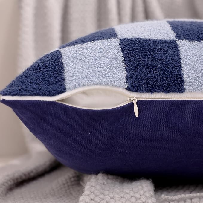 Alysheer Checkered Embroidered Decorative Throw Pillow Covers 18"x 18" Set of 2, Classic Chic Navy Blue Plaid Tufted Patterned Cotton Canvas Cushion Case for Sofa Couch Bed Living Room
