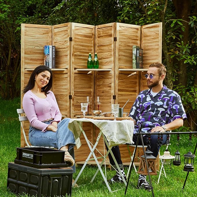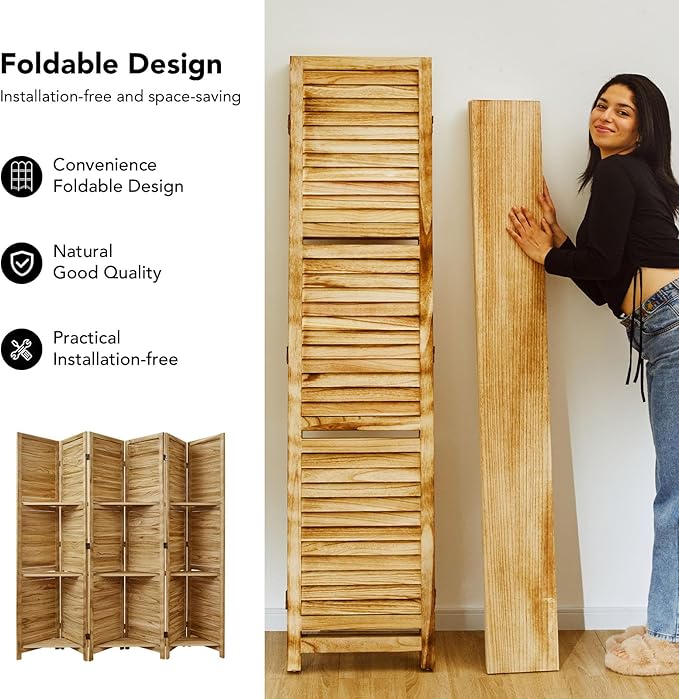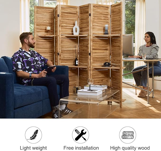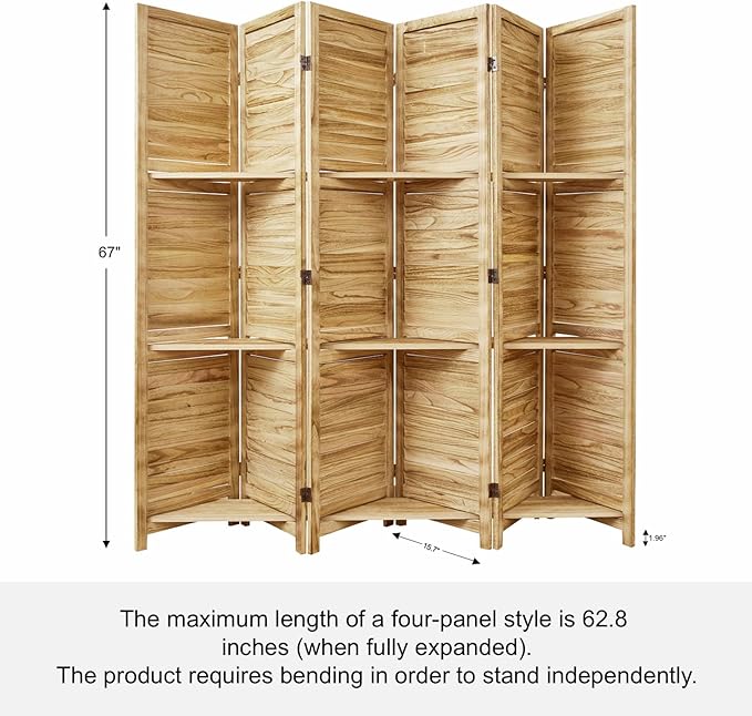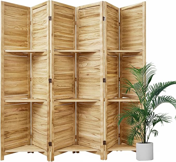 Room Divider with Shelves, 5.6 Ft Tall Folding Wood Screen with Double Hinges for Home Office Bedroom Hotel Decoration (6 Panels, Natural)