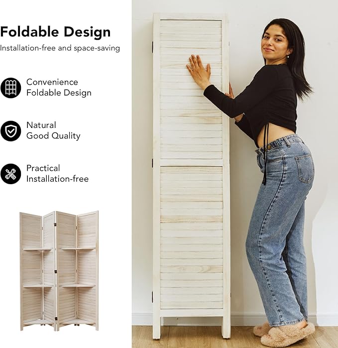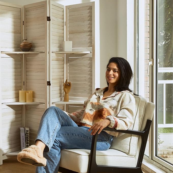 Room Divider with Shelves, 5.6 Ft Tall Folding Wood Screen with Double Hinges for Home Office Bedroom Hotel Decoration (4 Panels, White-Washed)
