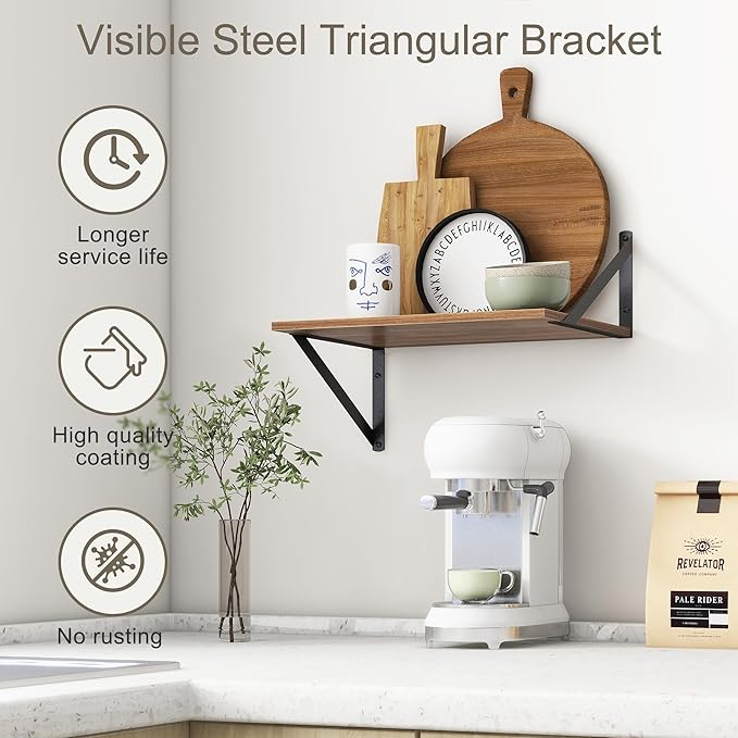 - 【FARMHOUSE RUSTIC WALL SHELF】These floating shelves are made of premium engineered wood board and visible triangular bracket. The rustic wooden grain surface add character and warmth to any modern or traditional interior with these deep floating shelves, contrast shelves at staggering heights on the wall or mount side-by-side or in the corner for a clean streamlined look.