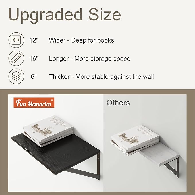 - 【12 INCH DEEP FLOATING SHELF】This extra deeper and wider wall shelves are 12 inches in depth and 16 inches in length instead of the regular narrow floating shelves, you can put photos, pictures, DVD players, videos, books, toys, and some other knickknack on this beautiful display wooden shelf.