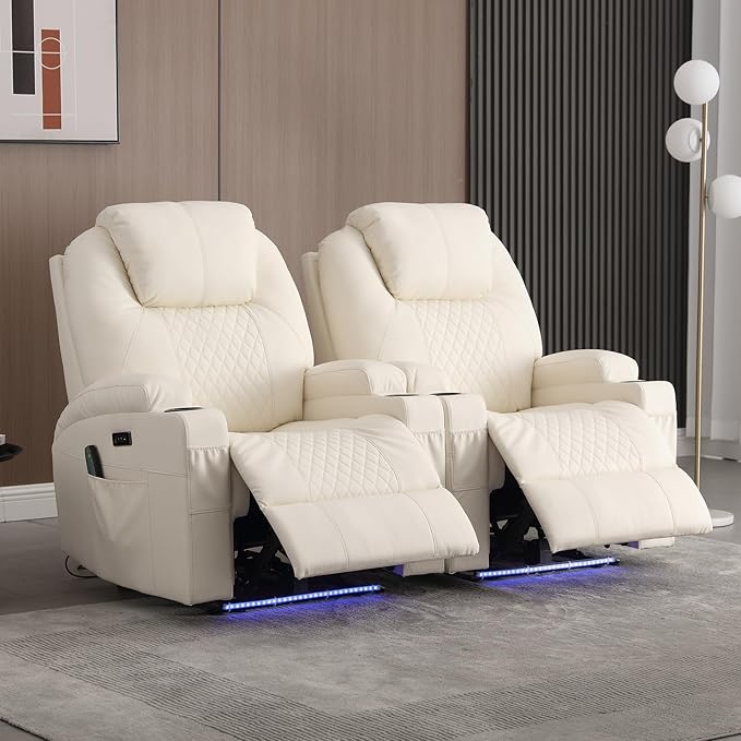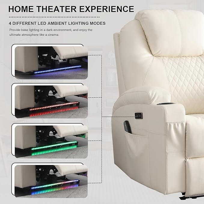 Power Recliner Chair with Heat and Massage, PU Leather Home Theater Seating with LED Lights/Cup Holders/Side Pocket/USB Port, Reclining Sofa Chair for Living Room(2, Beige)