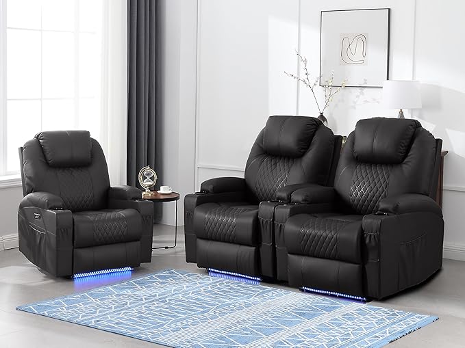 Power Recliner Chair with Heat and Massage, PU Leather Home Theater Seating with LED Lights/Cup Holders/Side Pocket/USB Port, Reclining Sofa Chair for Living Room (3, Black)