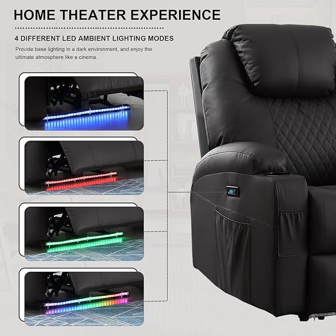 Power Recliner Chair with Heat and Massage, PU Leather Home Theater Seating with LED Lights/Cup Holders/Side Pocket/USB Port, Reclining Sofa Chair for Living Room (1, Black)