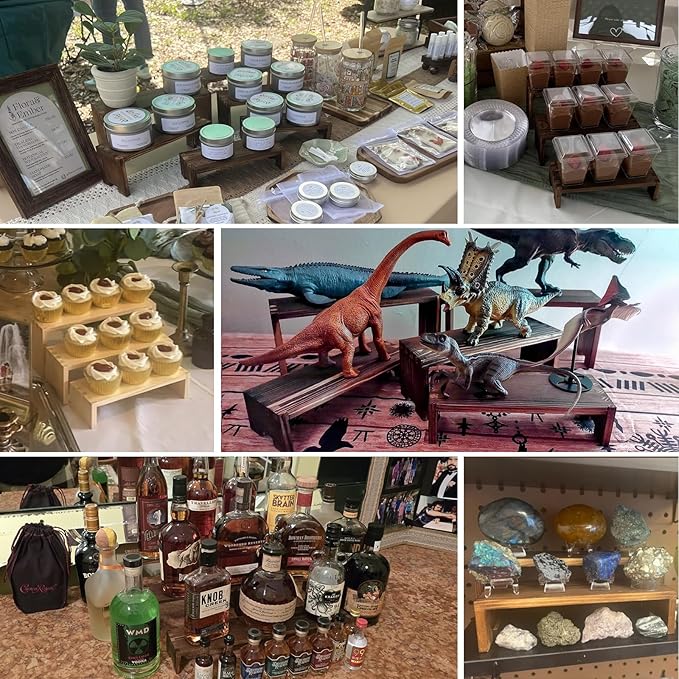 - 【Tierd Display Stands for Vendor】🎁: They are no need any tools then can be used directly! very convenient to display more items for vendors, they are not only beatiful but also improve space utilization rate, U-shaped wood risers, fire-carbonized, durable, non-toxic, odorless, and no deformation, nested design for easy storage in living room,bedroom,kitchen,indoor,outdoor, also can be used individually or as a set.