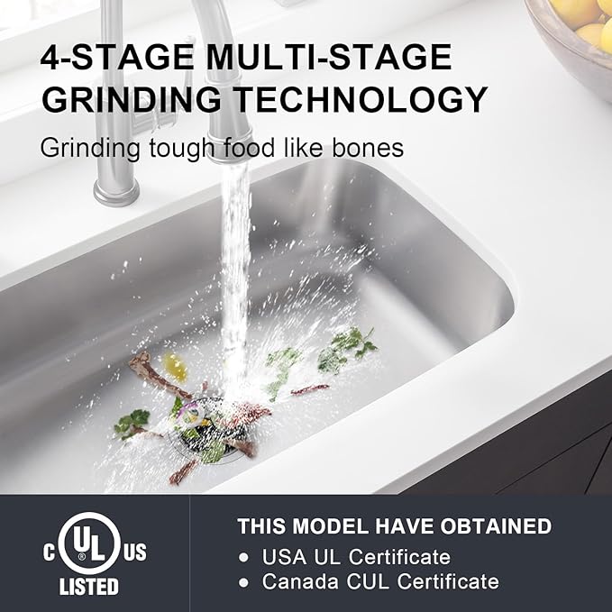 - Advanced Grinding Performance: 4-stage grinding technology pulverizes tough food waste like peach pits and small bones. High-speed AC motor delivers powerful performance while preventing clogs with precision-ground components.