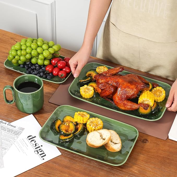vicrays Ceramic Rectangle Serving Platters - 14" 12" 10" Porcelain Serving Trays Plates for Party BBQ Appetizers Sushi Dessert - Microwave Oven and Dishwasher Safe - Set of 3 Green