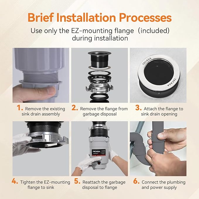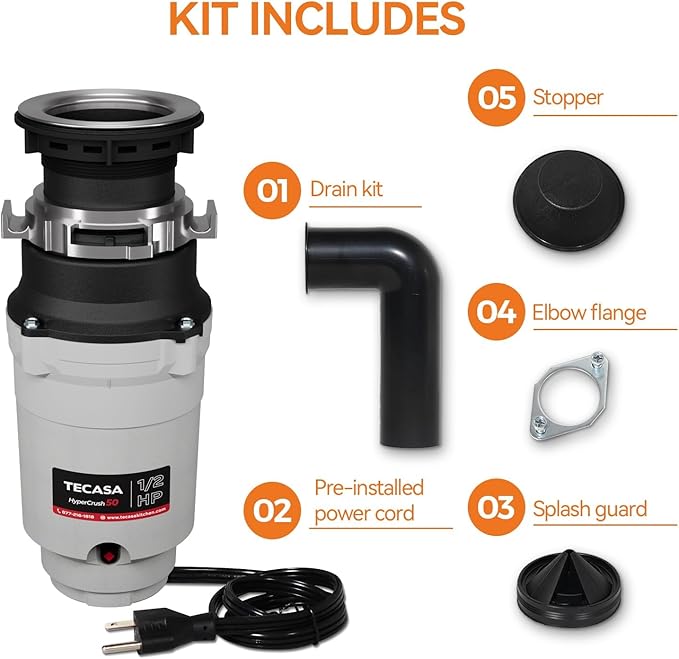 - 𝟏/𝟐 𝐇𝐏: The TECASA 1/2 HP garbage disposal is ideal for most home kitchens, fitting standard 3-1/2 inch sink openings. It comes with a pre-installed 39" power cord for quick and easy electrical connection. The compact, space-saving design features a DC motor that delivers instant, enhanced torque for efficient grinding operations.