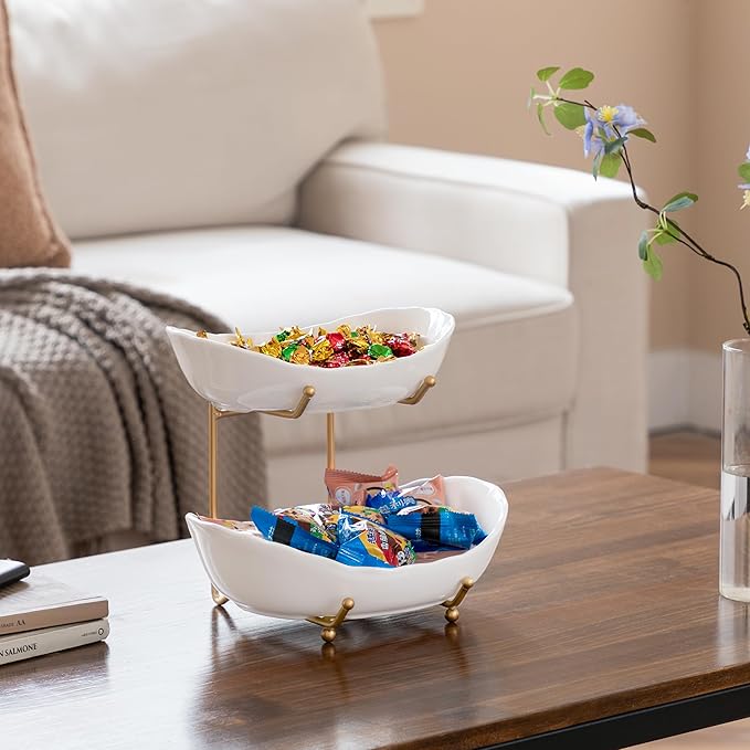 HBlife Fruit Bowl for Kitchen Counter - 2 Tier Fruit Basket with Metal Stand, Ceramic Fruit Holder for Fruit Vegetable Storage, Serving Platters Serving Trays for Party