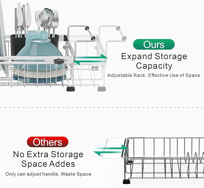- True Expandable, Real Capacity Boost: Unlike other racks that only extend handles, our dish drainer expands as a whole unit—truly increasing your drying space, allowing you to comfortably hold at least 3 extra cups in addition to 8 plates, bowls, utensils, and even fresh fruits and veggies. This innovative design not only ensures perfect sink compatibility but genuinely maximizes your drying area.