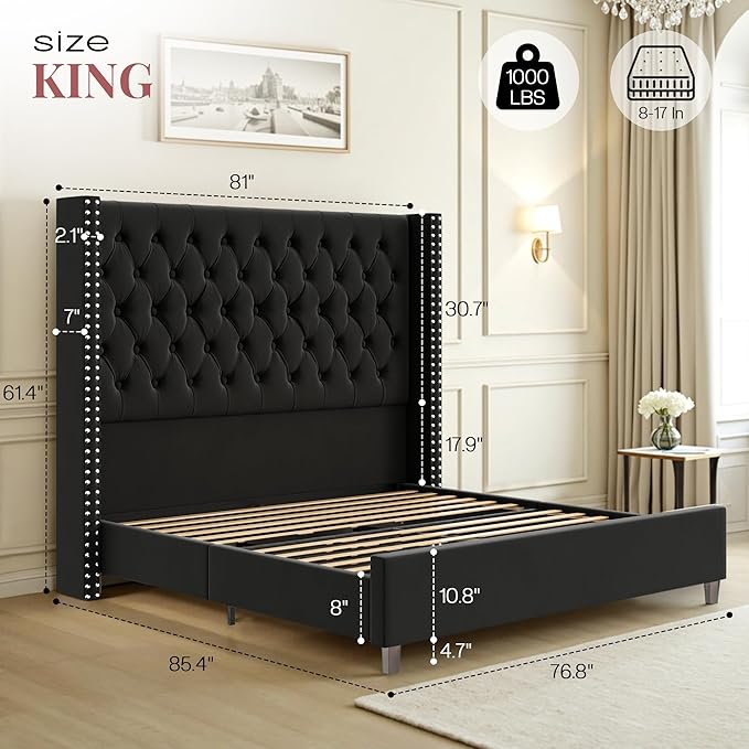 PaPaJet King Size Bed Frame with 61.4" Tall Headboard, Velvet Modern Upholstered Tufted Bed for Adults, Handmade Deep Button Tufting, Solid Wood Legs, No Box Spring Required, Black