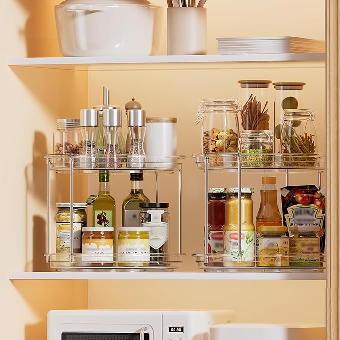 - Versatile Stackable Design: Customize your space by stacking these units into a 3-tier clear Lazy Susan organizer when you buy 2 Sets — well-suited for kitchen cabinet organizer spices or seasoning, cans, beverages, makeup, perfume, medicine, and more