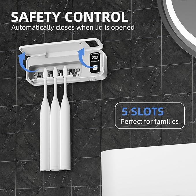 - Efficient and Safe: With the upgraded efficient UV light, our toothbrush holder kills 99.9% of the stains on your toothbrushes in just 200 seconds, then you'll have clean toothbrushes. When the cover is opened, the toothbrush covers UV light auto stop working to protect you and your family