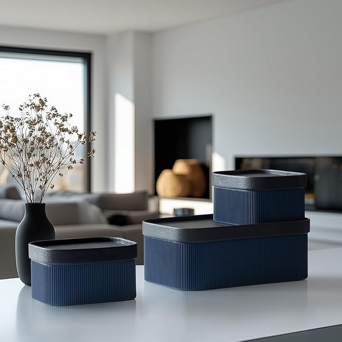 - TIMELESS STORAGE WITH A SUSTAINABLE TWIST: In a rich navy blue, this storage box set brings classic elegance and modern style to any room. With a robust MDF interior and luxurious vegan leather exterior, it's a chic, eco-friendly storage solution perfect for design-savvy spaces