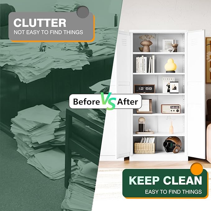 - Practical Design:Each door has 2 magnetic devices to ensure that the door is tightly closed;Two reserved holes on the back panel can be fixed on the wall; Metal cabinet with 5 adjustable shelves,6-floor storage space suitable for a variety of storage applications,improve space utilization by 80% compared to 4-layer cabinets