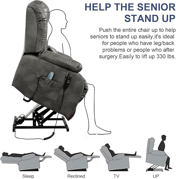 - [Upgraded Massage and Heating] The power lift recliner is equipped with 8 vibration nodes targeting the back, lower back, thighs and legs. There are also 5 vibration massage modes and 3 intensity options. You can enjoy a personalized full body massage experience at home. The lumbar heating function helps reduce fatigue by reducing pressure and improving blood circulation in the lower back.