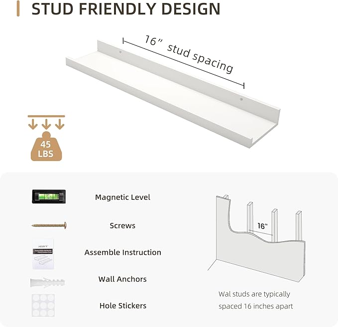 - 【Superior Quality】 Crafted from high-quality wood, each floating shelf is designed for long-lasting durability. The pre-drilled mounting holes are spaced 16 inches apart, ensuring a secure installation into wall studs.