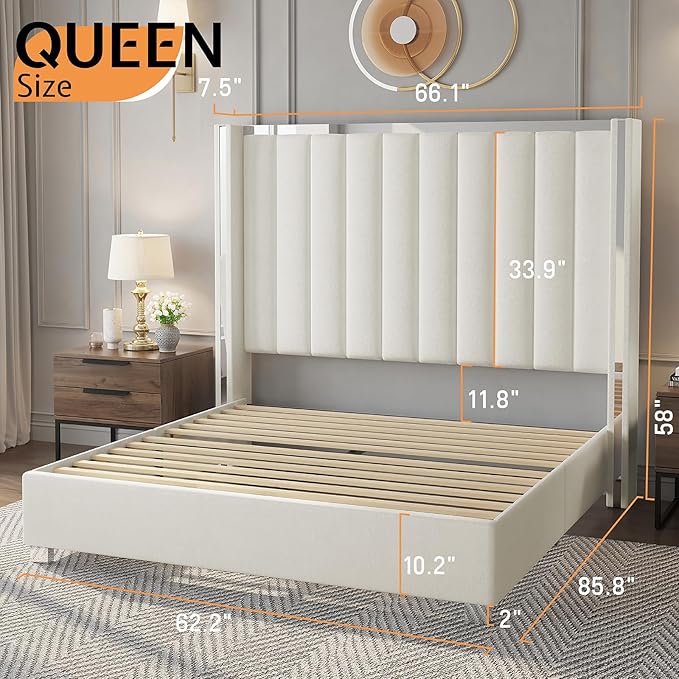 Jocisland Queen Size Bed Frame with 58" Tall Headboard, Platform Velvet Upholstered Bed with Channel Tufted Wingback Headboard and Plating Trim, No Box Spring Needed, White Cream