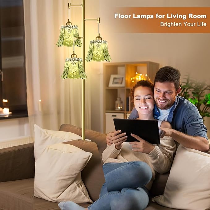 Gold Floor Lamp for Living Room,Bedroom,Tree 3 Light Standing Lamp Mid Century Modern Brass Tall Floor Lamps Vintage Retro Floor Lights Glass Green Flower Lamp Shade Farmhouse Boho Bohemian