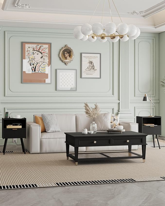 Nightstand,Modern Bedside Table with Storage Drawer and Open Wood Shelf, Accent Night Stand with Solid Wood Legs for Living Room, Bedroom and Small Spaces,Easy Assembly (Black-Outlet)