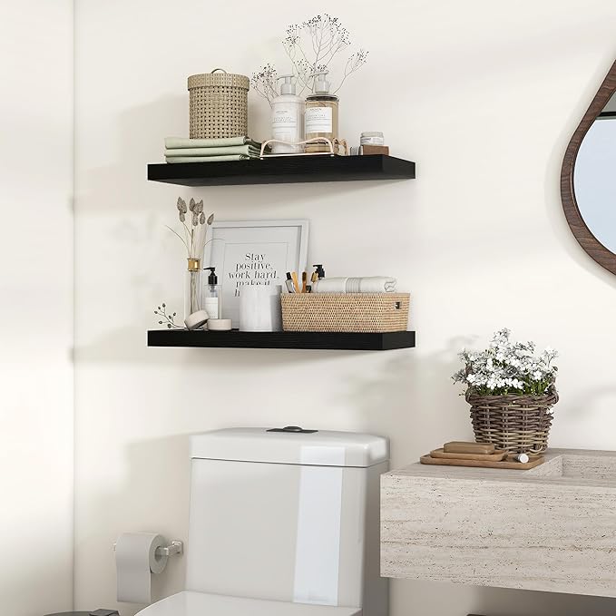 Heimlove 24 inch Floating Shelves for Wall,9.3 inch deep Black Wood Shelves with Invisible Brackets,Wall Mounted Storage & Display Shelves for Bedroom,Living Room,Set of 2